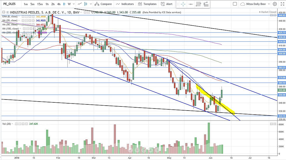 $Peoles11 jun 20181 Min. de lecturaAnálisis Técnico:MP rompe al alza cuña descendenteSoportes: 346, mm20Resistencias: 360, 364, mm50