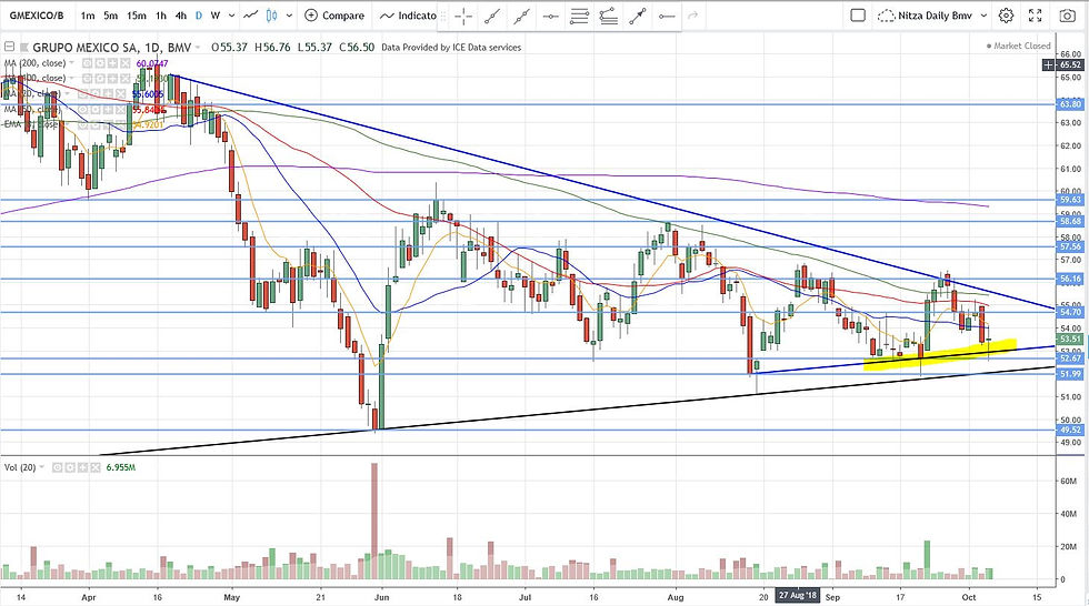 $Gmexic4 oct 20181 Min. de lecturaAnálisis Técnico: MP Dentro de triángulo simétricoSoportes: Zona amarilla, 52.67Resistencias: todas las medias móviles 54.7 Sentimiento CP: neutral con cierres por encima zona amarilla